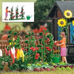 Femme cueillant des tomates. Avec 3 plans de tomates, tuteurs (haut. 25 mm) et arrosoir.