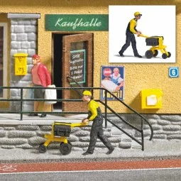 Figurine Busch 7888 représentant un facteur avec chariot de livraison à l’échelle HO. Un accessoire idéal pour compléter un décor de réseau ou de maquette ferroviaire.