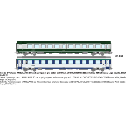 Set de 2 voitures voyageurs REE référence JM050 à l'échelle HO 1/87 : une voiture ambulance et une voiture Corail B10c10x vert/gris, logo nouille, pour la SNCF. Modèle pour réseau 2 rails courant continu, époque IV-V.