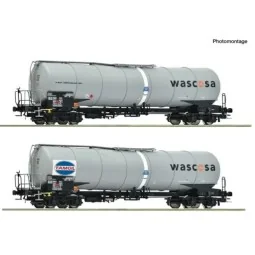Set de 2 wagons-citernes à 4 essieux de type Zacns en livrée Wascosa/Tamoil. Modèle Roco à l'échelle H0 1/87, époque VI, avec mains courantes rapportées et passerelles finement ajourées.