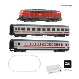 Coffret numérique de départ ROCO 5110012 en H0 1/87 avec locomotive diesel série 218 de la DB AG, deux voitures Intercity, centrale Z21 START newGen, alimentation et voie ovale ROCO LINE avec ballast. Pilotage avec l’application Z21.