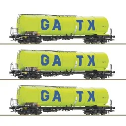Set de 3 wagons-citernes à 4 essieux type Zacns de la société privée GATX. Modèle Roco à l'échelle H0 1/87, époque VI, avec mains courantes rapportées, passerelles ajourées et attelages NEM 362 à élongation.